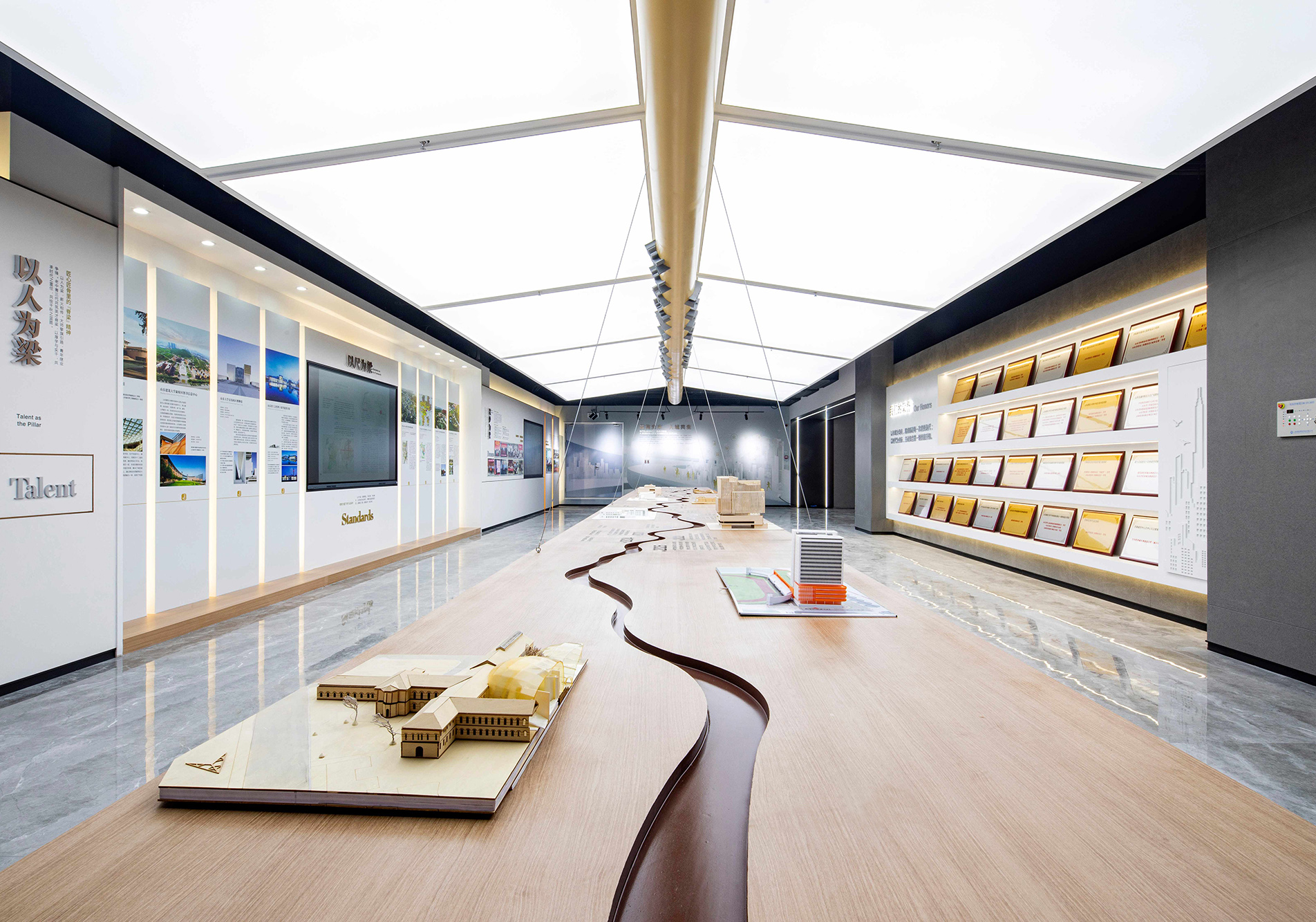 山东省劳模劳动工匠精神教育基地位于全国劳模时传祥的家乡齐河县,总建筑面积约3.9万平方米,建筑的构思立意为“劳动托起中国梦”。我们用简洁、有力量的的几何形体,隐喻“托举”之形,表达对劳动精神的崇敬之意。通过几何构成的美感、大面积的虚实对比,和对建筑比例与尺度的的控制,实现丰富的空间感受,我们重视光线对建筑体量和空间的渲染,使建筑具有雕塑感和静谧感。